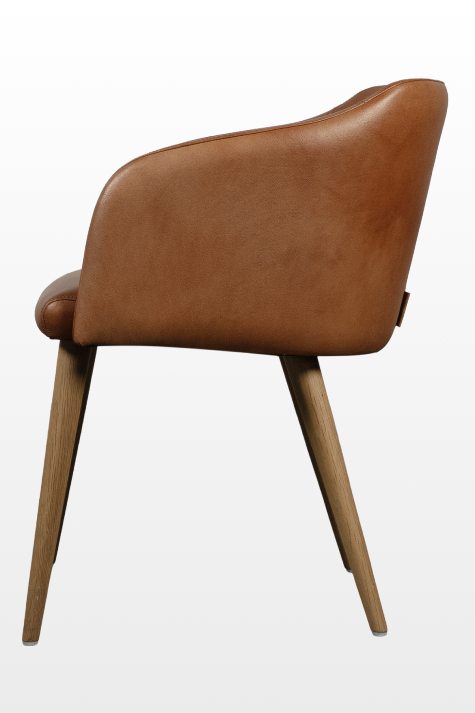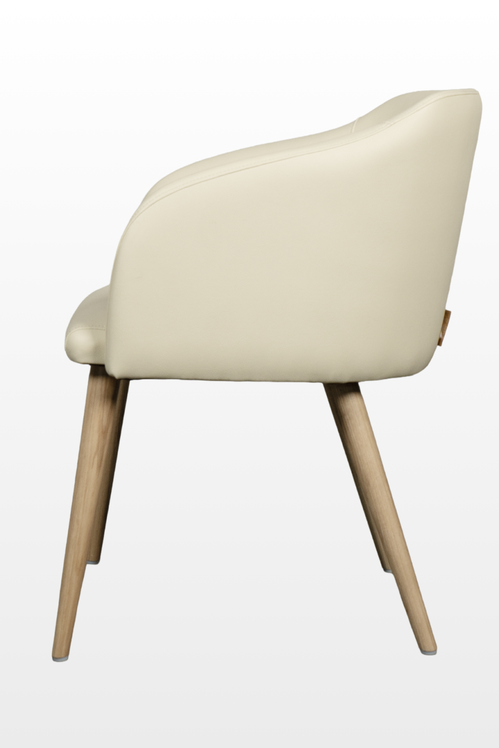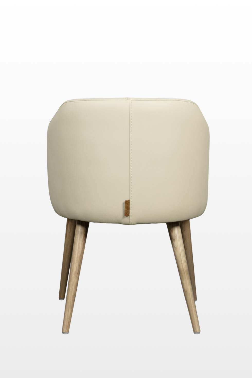 The natural wooden legs add warmth and durability, balancing modern style with organic charm. Subtle stitching enhances the refined look, while the ergonomic shape ensures supportive seating for both dining and casual settings.