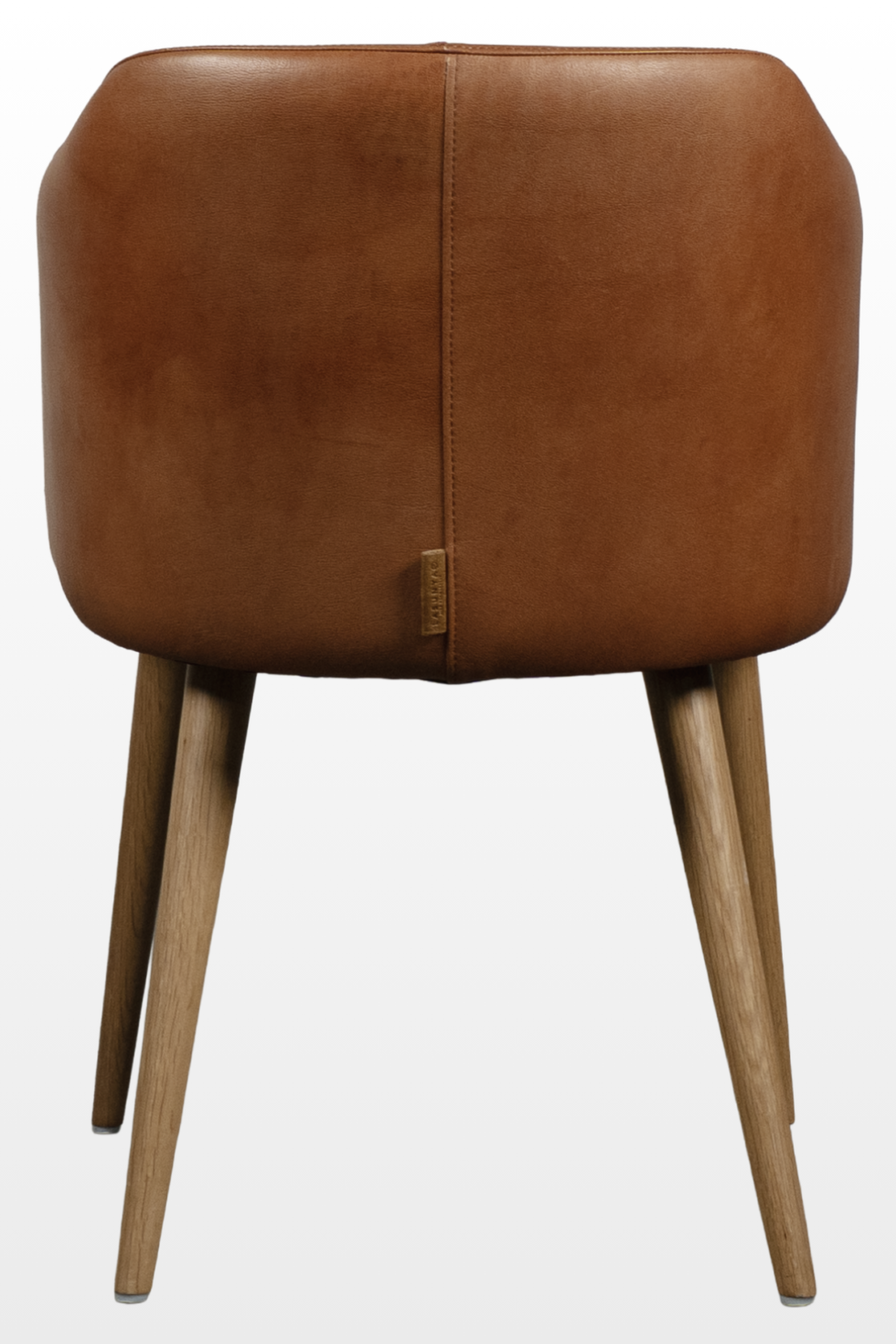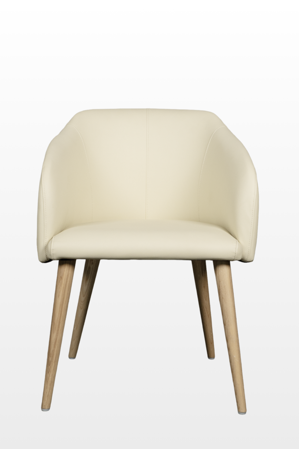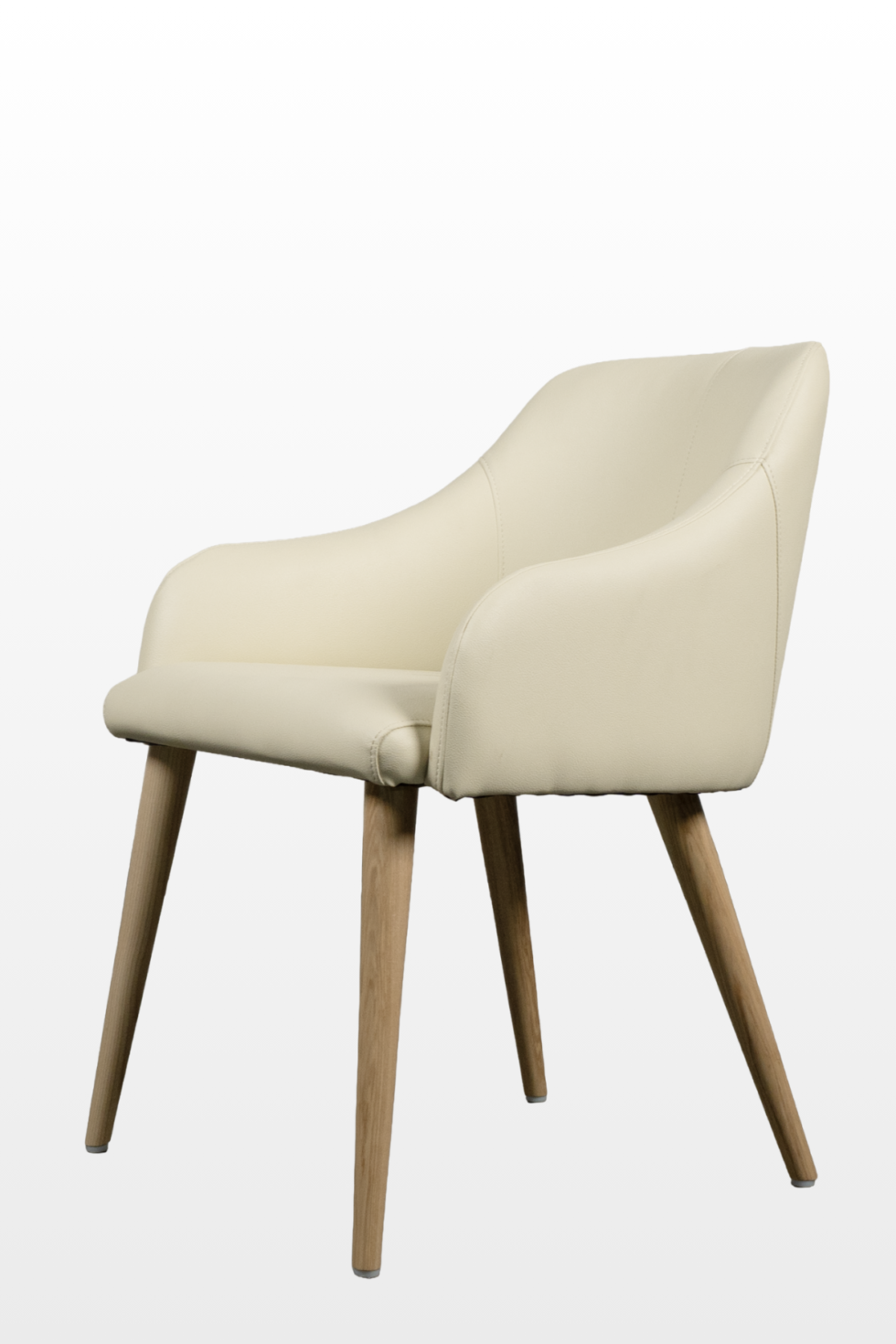 The natural wooden legs add warmth and durability, balancing modern style with organic charm. Subtle stitching enhances the refined look, while the ergonomic shape ensures supportive seating for both dining and casual settings.